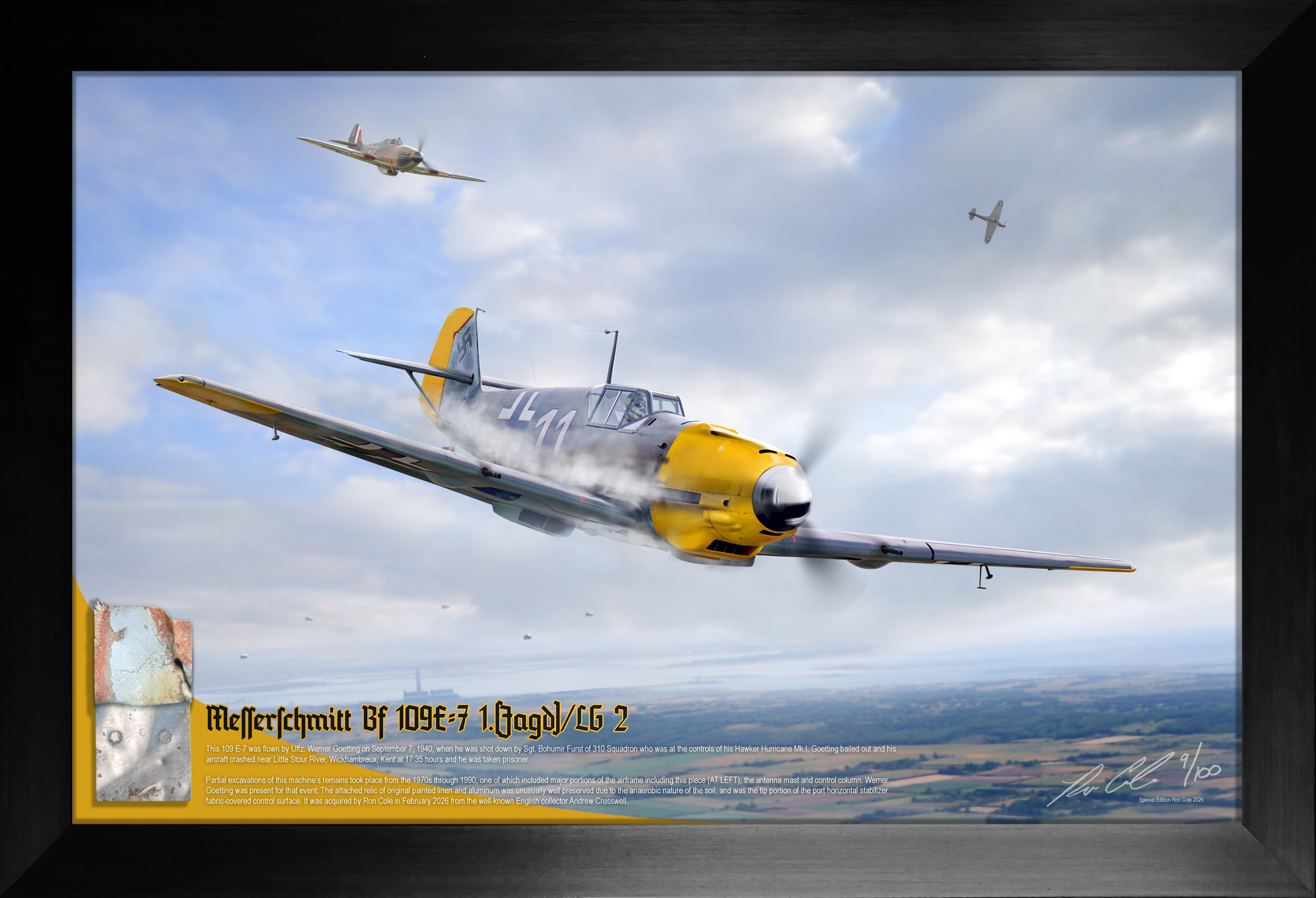 A rare opportunity to own and display an authentic piece of ultra-rare World War I aviation history combined with the breathtaking original art by Ron Cole in a ready-to-hang limited...