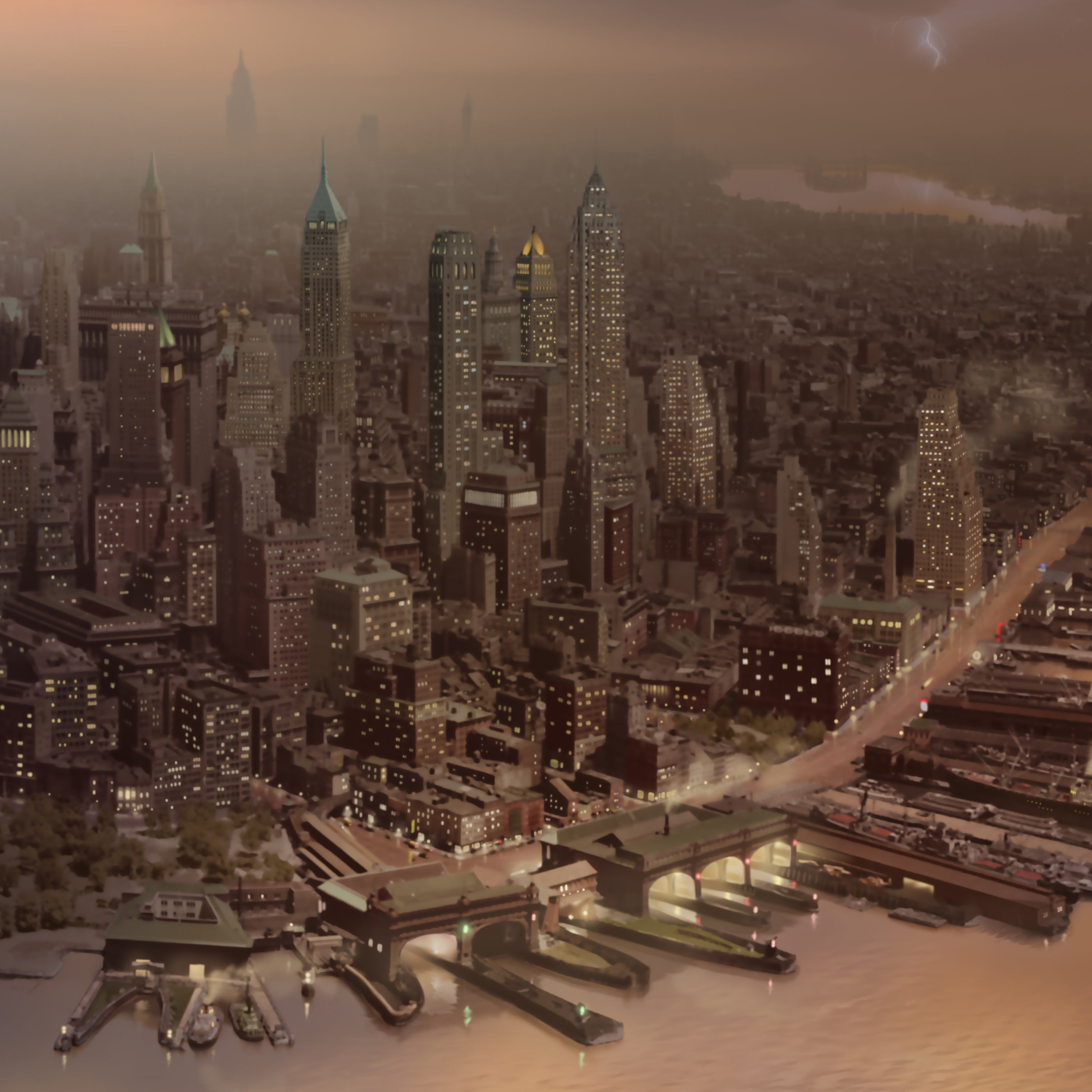 This composition was inspired by several impactful period photos from that time and place. The end of the luxury liner is foretold by the docks in the lower foreground, as is the tragic fate of the airship by the thunderstorm in the far distance.