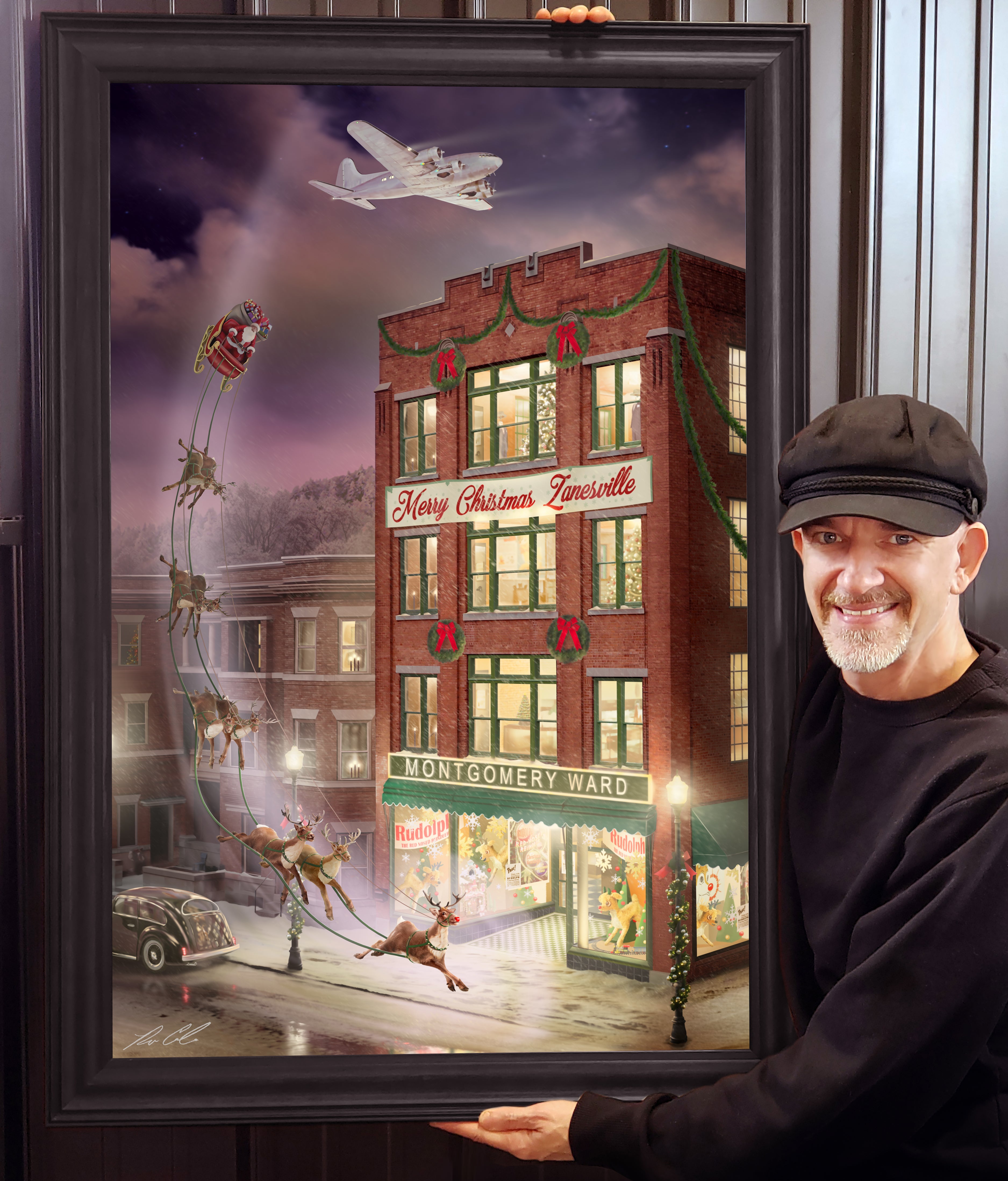 My painting of Montgomery Ward in Zanesville, Ohio blends historically accurate details that reveal how this beautiful building appeared that Christmas in 1939, as well as surrealistic images borrowed directly from Robert May's original hand-illustrated manuscript, including Rudolph leading Santa's sleigh and the Boeing 307 Stratoliner flying overhead. I've added a c. 1939 plush 'Rudolph' in the store window, seemingly coming to life in astonishment upon seeing his real-life self.